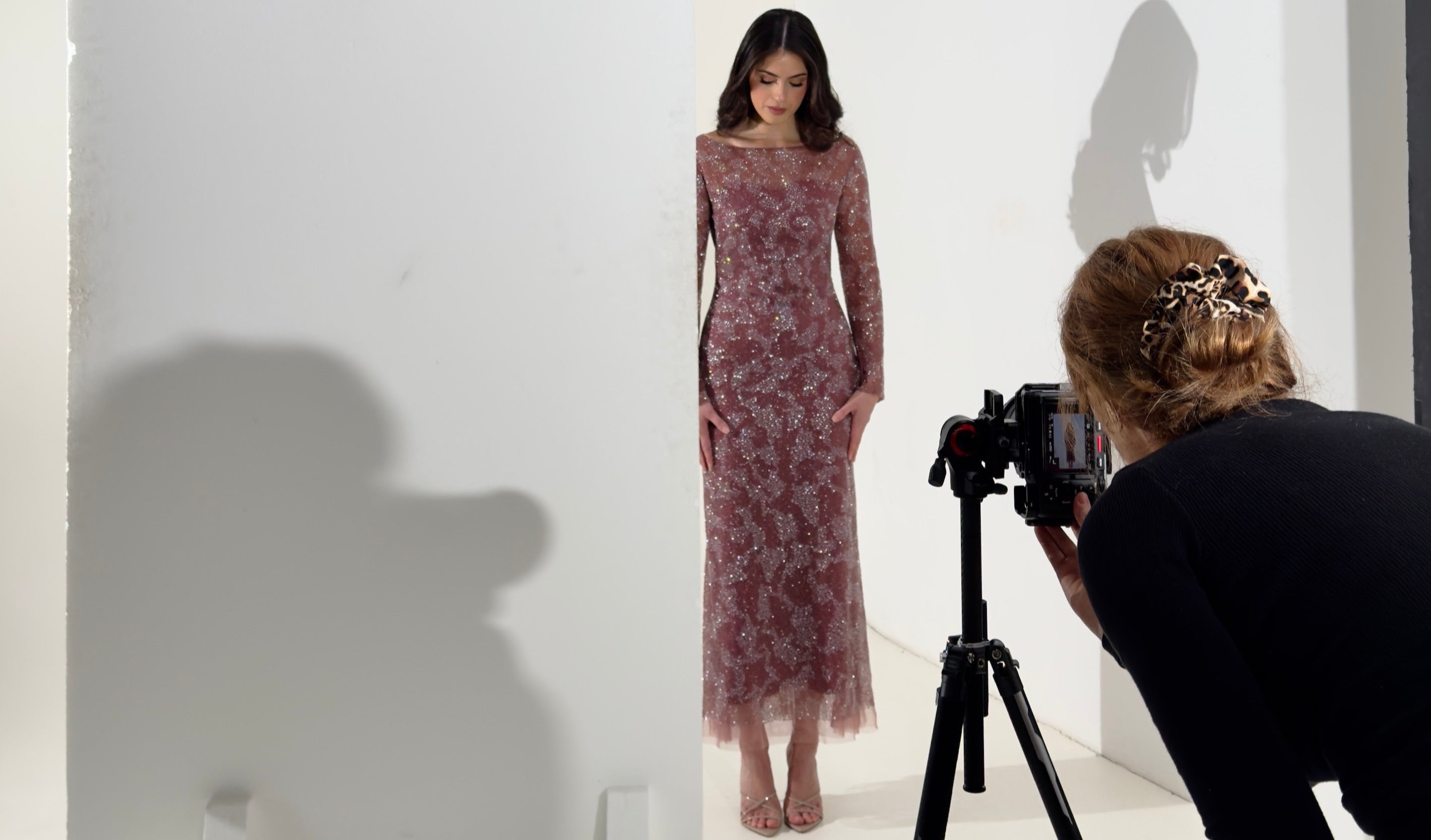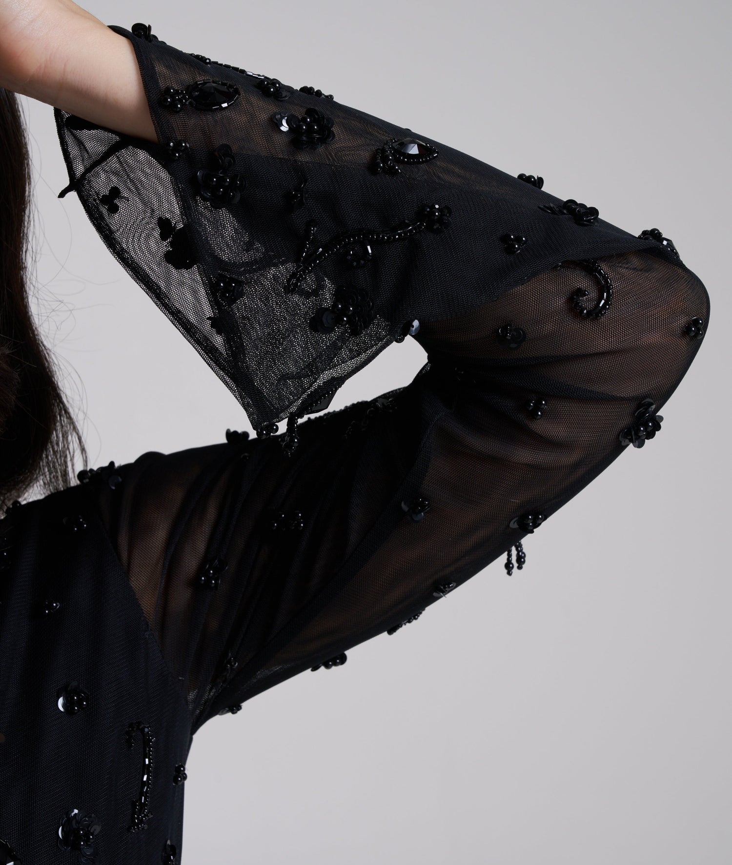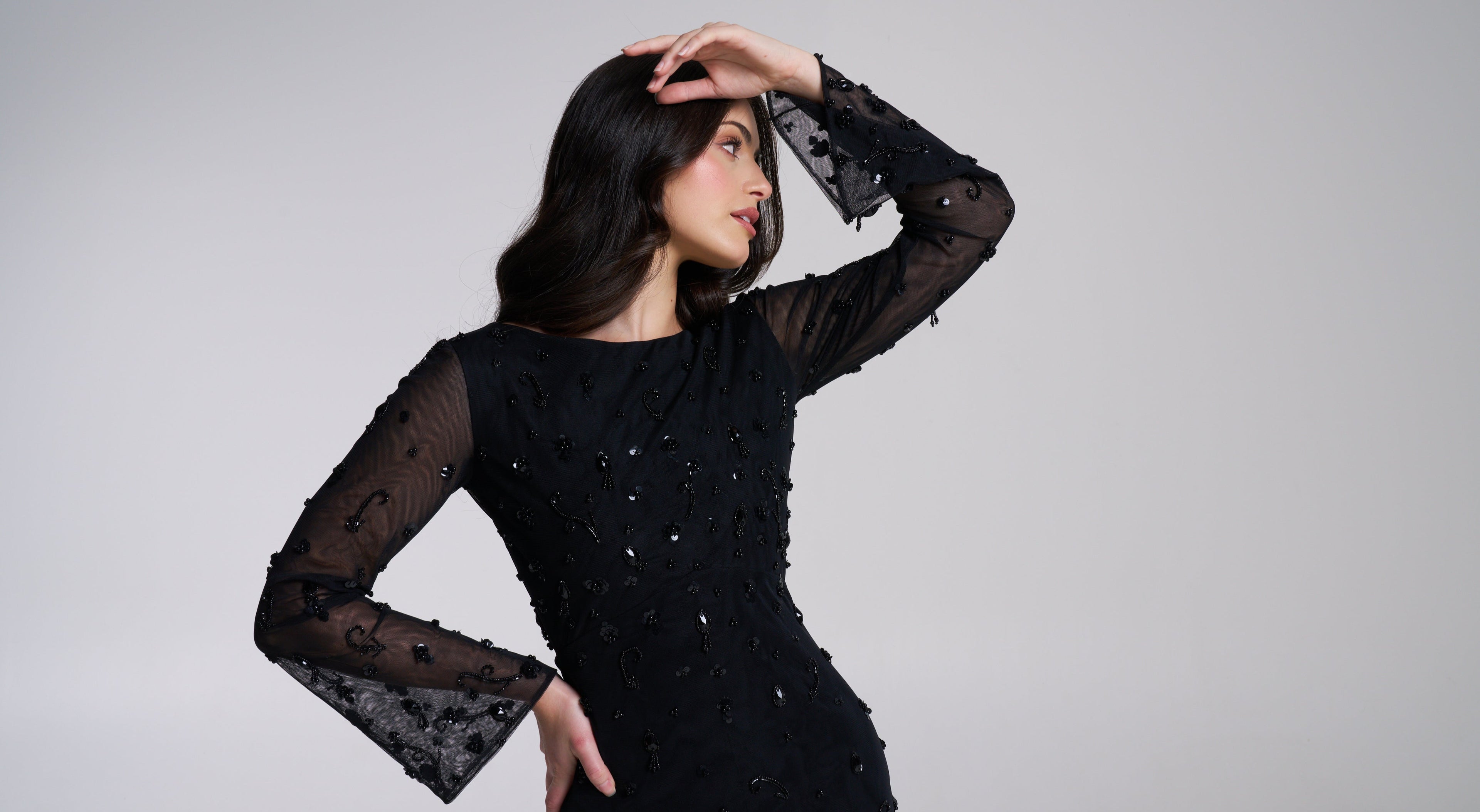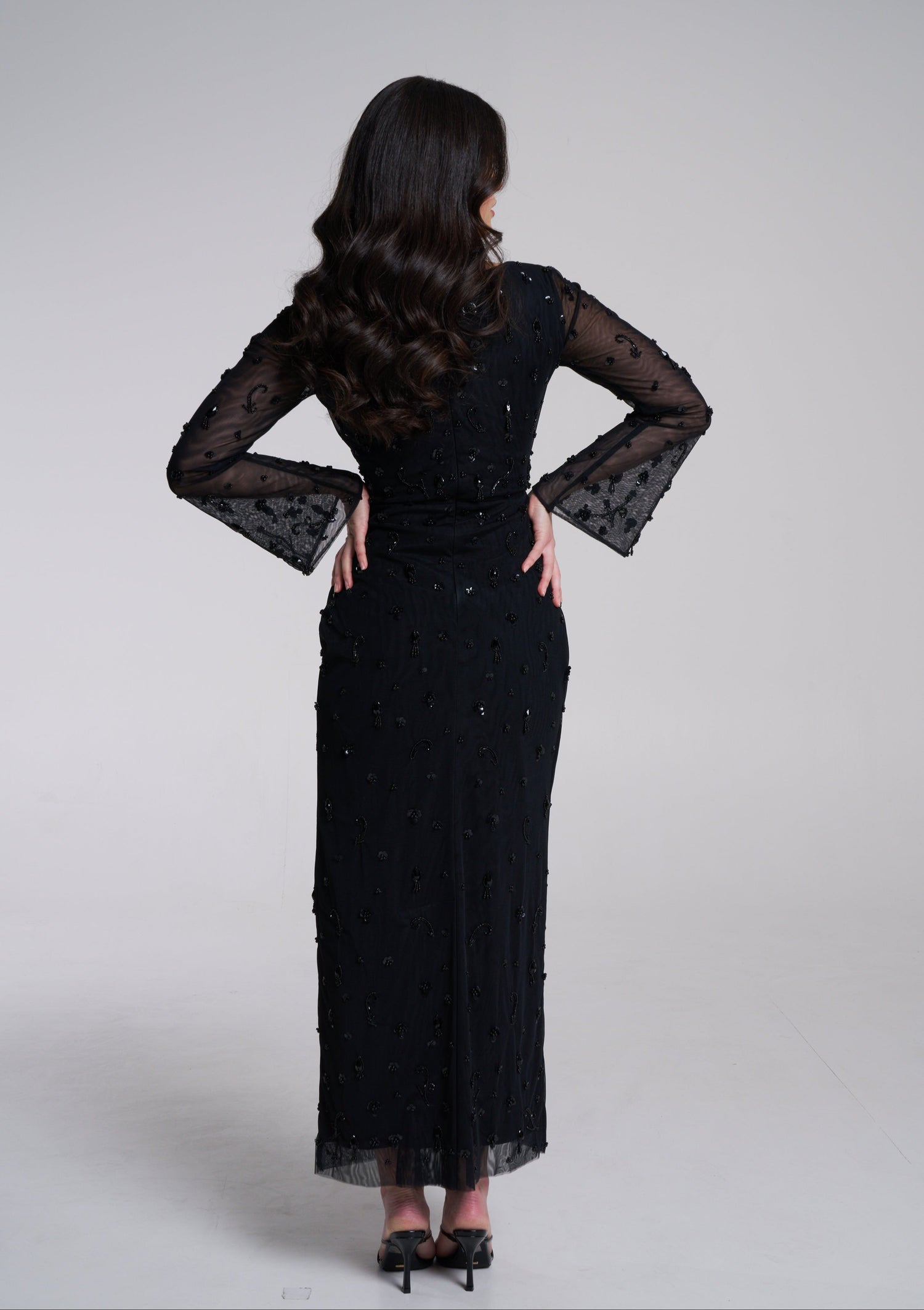 A sleek silhouette brought to life through intricate detailing — each embellishment delicately hand-sewn, piece by piece. Every thread, bead, and sequin is a testament to time-honoured craftsmanship.